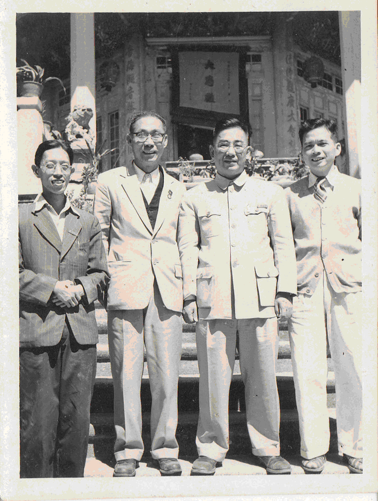 1956年12月29日,四位省立厦门中学的师生在南普陀大悲殿前合影。左起:江培萱(原初中学生),庄奎章(原校长),卢嘉锡(原任课教师),何恩典(原高中学生)