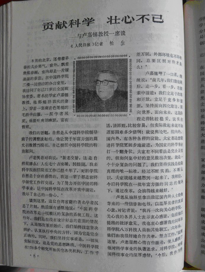 1987年3月,《人民日报》记者柏生采访卢嘉锡,在《人民日报》上刊登了题为《贡献科学壮心不已——与卢嘉锡教授一席谈》的采访录