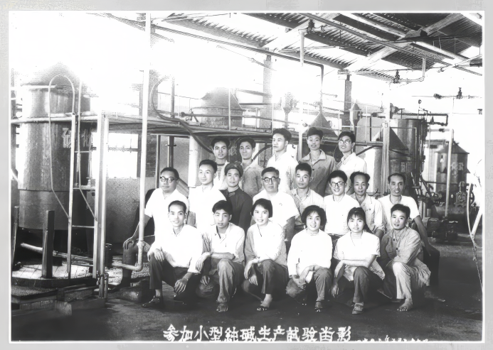 1972年5月龙海酒厂小型纯碱生产试验成功后参试人员合影。二排左四为卢嘉锡