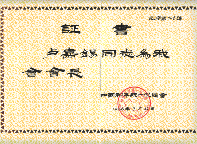 1953年,卢嘉锡加入中国农工民主党,并由一名普通党员一步步成长为民主党派中央领导。作为中国农工民主党的卓越领导人,对农工党的建设和发展倾注了大量心血,他号召农工党党员以主人翁态度,发挥科技专长,为国家发展献计献策,开展智力支边,致力社会服务,带领农工党在建设中国特色社会主义参政党的实践中取得了显著成绩。1993年4月,在中宣部召开的爱国主义教育座谈会上,卢嘉锡同志发表了题为《知我中华、爱我中华、兴我中华》的发言,对爱国主义精神作了详细精辟的论述,在国内外引起强烈反响,对爱国主义教育起到了有力的推动作用。他以渊博的学识、坦诚的态度、诤友的胸怀,体现了一个参政党领导人的高贵品质。