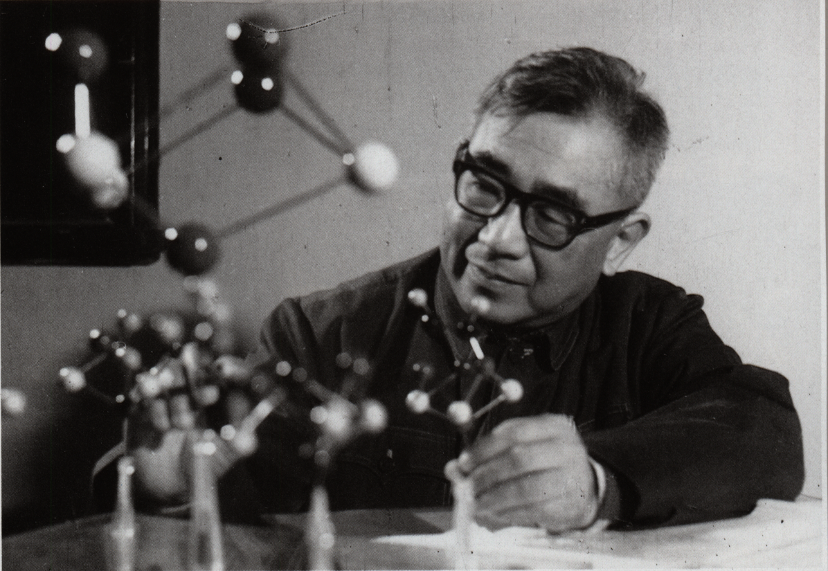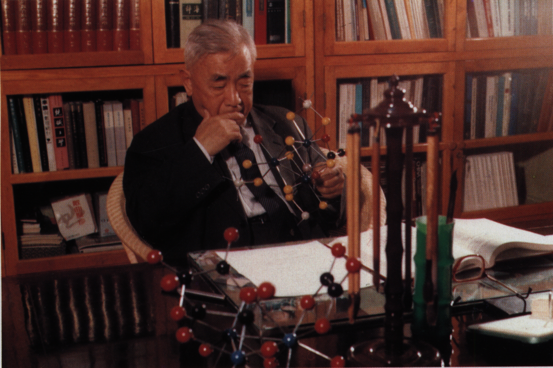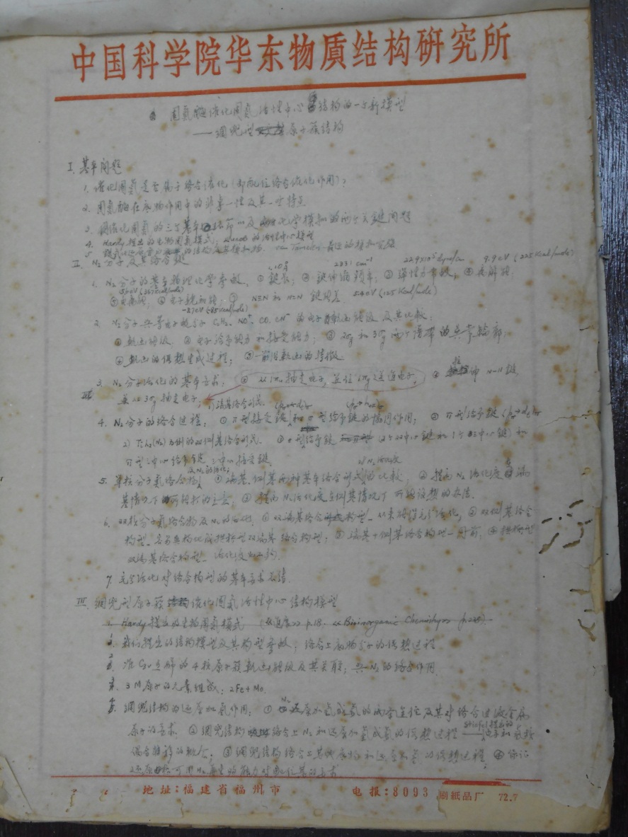 图:1973年,以卢嘉锡为首的物构所固氮研究组在《科学通报》发表“固氮酶催化固氮活性中心的初步模型”,固氮酶活性中心的结构模型——福州模型Ⅰ。这是一个一钼三铁三硫(MoFe3S3)的网兜式结构,可以投网式络合活化氮分子。由于其形状有点像网兜,因此卢嘉锡把它形象化地称为网兜状结构模型。图为卢嘉锡在书房思考固氮模型问题。