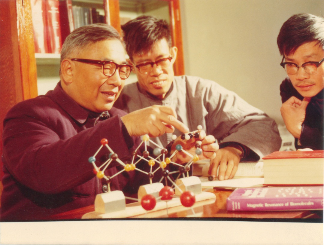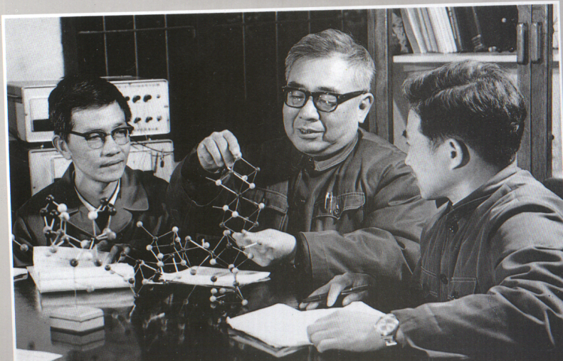图:与青年科研人员讨论原子簇化合物。左起:庄伯涛,卢嘉锡,赵孝腾