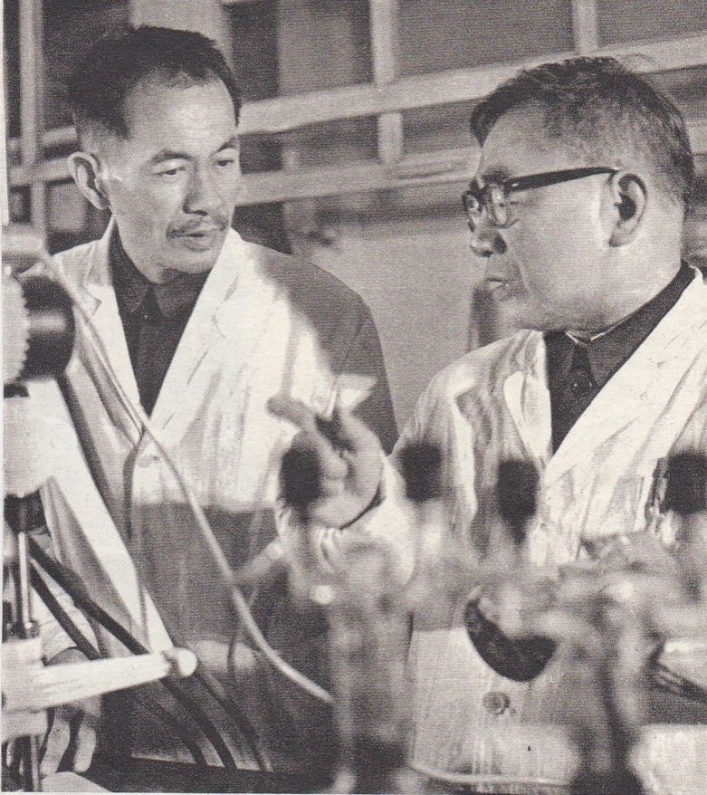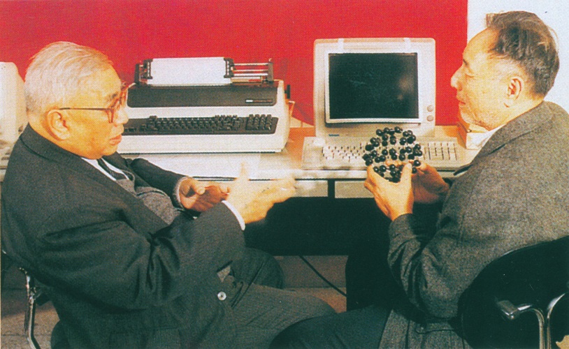 图:为了验证固氮模型是否正确,卢嘉锡一方面带领物构所课题组,合成了一系列模拟物(F系列),另一方面又组织物构所一部分力量与兰州大学黄文魁合作,合成出另一系列的模拟物(G系列)。课题组对两类模拟物进行结构表征,同时对模拟物与乙炔、氮气等底物作用进行活性测试,取得了一些有益的结果。这一系列研究成果发表在第四届国际固氮会议论文集中。图为卢嘉锡与兰州大学黄文魁教授(左)合作研究固氮模型物的合成。