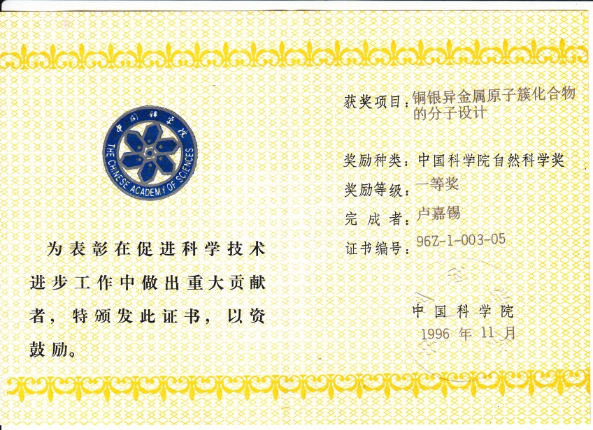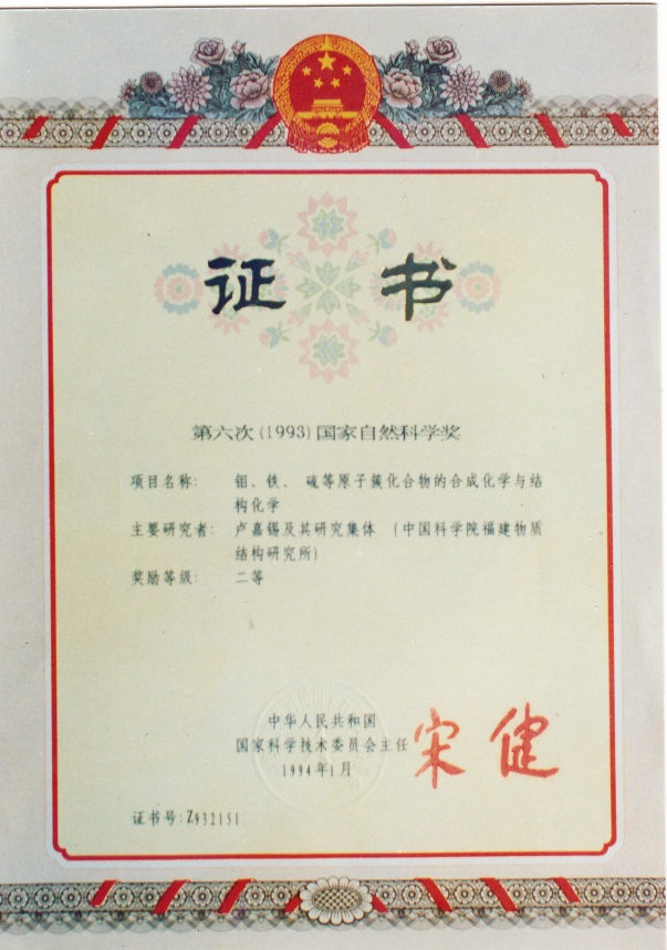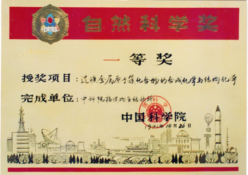 图:卢嘉锡及其团队在原子簇化学方面的突出贡献,曾获得1991年中国科学院自然科学一等奖和1993年国家自然科学二等奖。