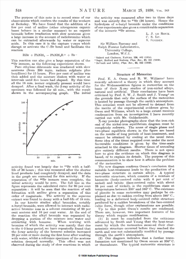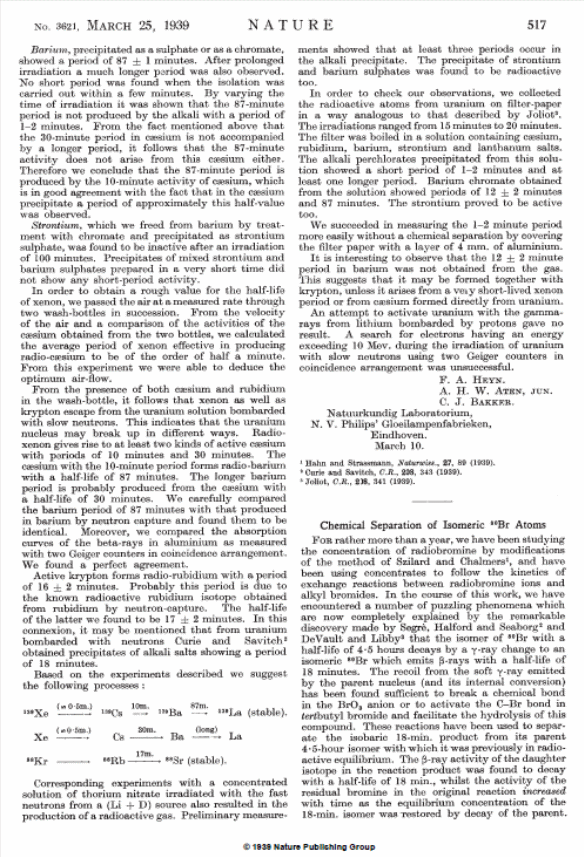 图:卢嘉锡发表在1939年3月25日自然杂志上的论文“溴80同位素原子的化学分离”。