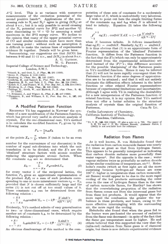 图:卢嘉锡发表在1942年10月自然杂志上的论文“一个修正的Patterson方程”。