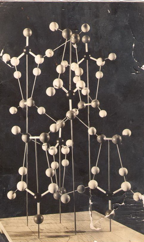 图:卢嘉锡首先测定了脲-过氧化氢加合物的晶体结构,并做成晶体模型。他很喜欢这个模型,回国后在厦门大学任教时经常拿给学生看。