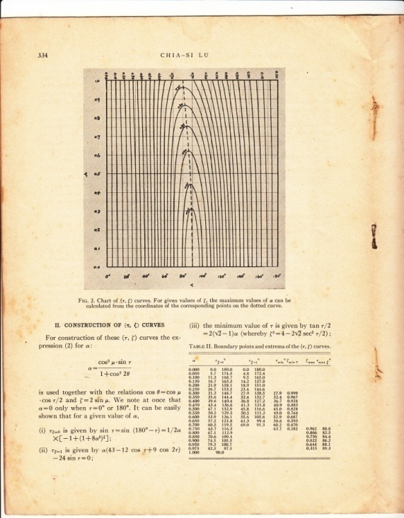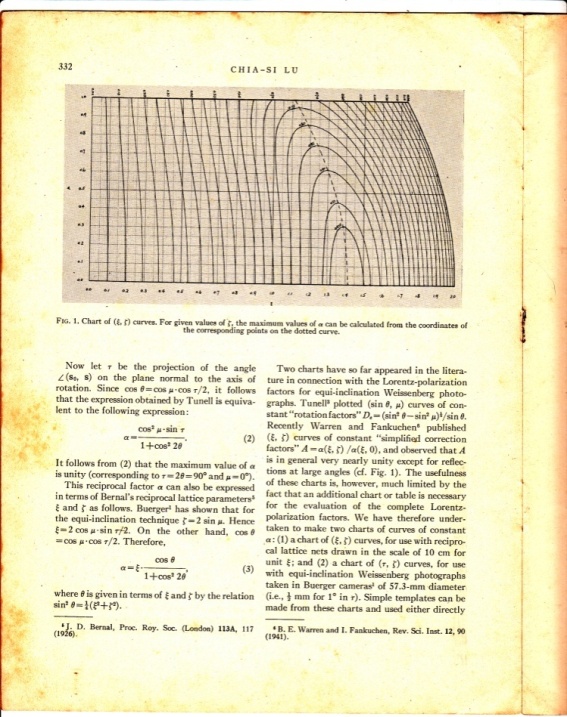图:在结构分析方法上,卢嘉锡提出一种处理等倾斜魏森堡衍射点的洛仑兹因子的图解法,成为当时国际上普遍采用的一种简便的方法,曾被收入《国际晶体学教学用表》(第二版)。图为卢嘉锡发表在1943年11月《科学仪器评论》上的论文“等倾斜魏森堡照相的倒易L-P因子图”首页及两组曲线图。