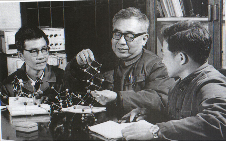 与青年科研人员讨论原子簇化合物。左起:庄伯涛,卢嘉锡,赵孝腾
