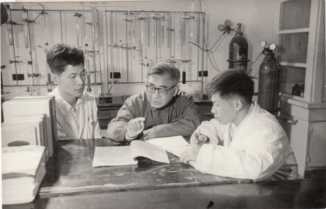 悉心指导福大青年教师。左起:陈天明,卢嘉锡,魏可镁