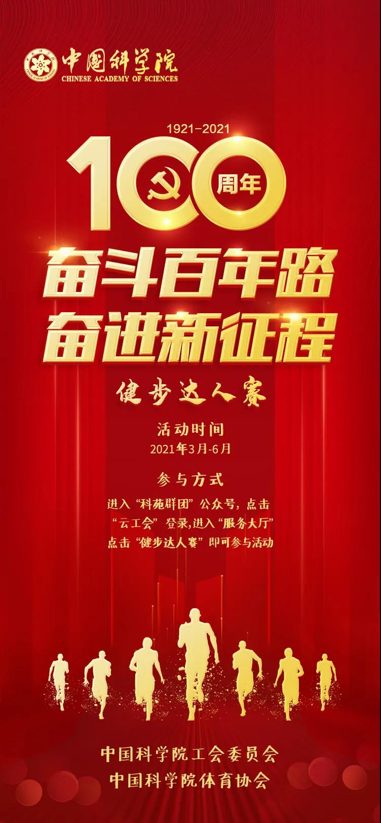2021年是中国共产党成立100周年,也是中科院开启全面实现“四个率先”新征程的关键之年,院工会、院体协将结合党史学习教育,在全院范围举办中国科学院“奋斗百年路奋进新征程”健步达人赛。