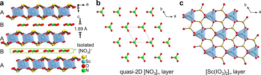近日,同济大学张弛教授与中科院北京理化技术研究所和中科院福建物质结构研究所合作,以经典的无机π共轭硝酸盐为合成模板,通过等价氧阴离子取代策略,构建了一例紫外吸收截止边短、带隙宽、双折射率大、且同时具有强倍频效应的复合型二元氧阴离子晶体材料Sc(IO3)2(NO3)。日前,相关成果以“Giant Optical Anisotropy in the UV-Transparent 2D Nonlinear Optical Material Sc(IO3)2(NO3)”为题在线发表在Angew. Chem. Int. Ed.期刊上(2020, DOI: 10.1002/anie.202012456)上。