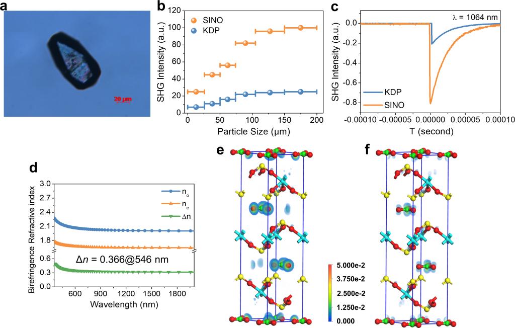 作者表示,复合型二元氧阴离子晶体结构在光学各向异性和倍频效应两种光学响应中有独特的优势。首先,在稀土硝酸盐中引入含孤对电子氧阴离子[IO3]-基团,提高了材料整体的光学各向异性。其次,[IO3]-和[NO3]-两种氧阴离子基团在二维层状结构中采用对齐排列方式,增大了层内键合和层间相互作用的差异,赋予材料相比于传统单一氧阴离子无机金属氧化物增益的光学各向异性和倍频效应。同时,密度泛函理论模拟计算表明Sc(IO3)2(NO3)大的线性光学和非线性光学响应源自于二维层状结构中[IO3]-和[NO3]-基团的协同效应。作者通过实空间原子切割方法进一步证明了双折射率的增益主要来源于含孤对电子的氧阴离子[IO3]-基团,而强的倍频效应则主要源自于π共轭[NO3]-基团。最终,该复合型二元氧阴离子晶体Sc(IO3)2(NO3)表现出短的紫外吸收截止边(298 nm),宽的光学带隙(4.15 eV),大的双折射率(0.348@546 nm),该双折射率值在目前已报道的无机金属氧化物晶体中为最大值;Sc(IO3)2(NO3)同时具有强的倍频效应(4.0 × KDP),是一例性能优异的紫外双功能晶体材料。该工作为探索紫外波段下大双折射晶体材料提供了一种全新的策略。