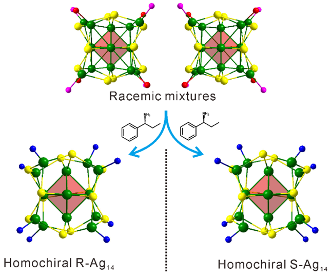 表面配体是决定纳米团簇/纳米颗粒化学或物理性质的重要因素之一。然而,在不改变原子结构的情况下,通过配体工程来调控金属团簇的电子结构仍然是一个挑战。另一方面,手性金属团簇在不对称催化、手性传感等领域具有潜在应用。但多数手性团簇是以外消旋体的形式存在,难以获得光学纯的单手性团簇。