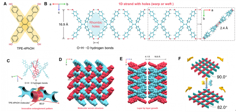 近日,中山大学的池振国教授团队及其合作者采用独特的编织技法,首次报道了一种由一维带孔长链交织而成的动态二维(2D)编织氢键有机框架(HOF)。他们首先合成四苯酚基取代的四苯基乙烯(TPE)衍生物TPE-4PhOH,并把它作为编织的原材料。随后,通过结晶处理,成功构建了一个编织的HOF(命名为2D-90)。TPE-4PhOH分子呈现出几何上定义良好的X形结构,酚基附着在TPE核心的外围。当每个X形TPE-4PhOH与两个相邻分子相互作用,形成四对分子间O-H···O氢键时,TPE-4PhOH组装为一维长链,即编织材料的经线或纬线,长链上带有具有规则间隔的菱形孔。当不同方向例如垂直方向长链上的有机分子插入这些菱形孔中,进而展现出由一维长链构造的互锁模式。在单晶结构的c轴上可以观察到双轴的编织结构,经纬线夹角为90.0°。同时,在单晶结构的a轴和b轴上可以观察到非常规整的层状结构,表明这是一个二维编织结构。此外,研究者还利用TEM、HRTEM、cryo-EM、AFM和理论模拟等多种手段对其单晶结构进行了深入而全面的研究。