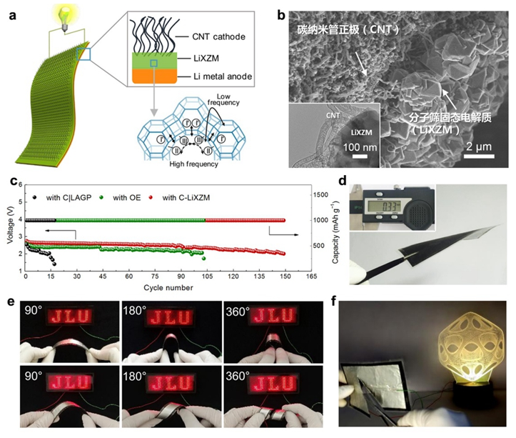 图1:a,分子筛基固态锂空气电池一体化设计。b,分子筛固态电解质-碳纳米管正极一体化结构的扫描电镜图和透射电镜图。c,基于有机电解液、商用LAGP和分子筛固态电解质的锂空气电池的循环寿命对比。d,厚度仅为0.33mm的固态锂空气电池的光学照片。e,固态锂空气电池的柔性。f,固态锂空气电池的安全性和环境适应性。