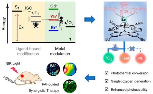 北京大学化学与分子工程学院张俊龙课题组与美国德州大学奥斯汀分校的Jonathan L. Sessler教授合作,巧妙通过稀土金属的置换,调控金属配合物的激发态能量耗散过程,进而实现汇集光治疗和诊断功能于同一分子的光敏剂(图1)。