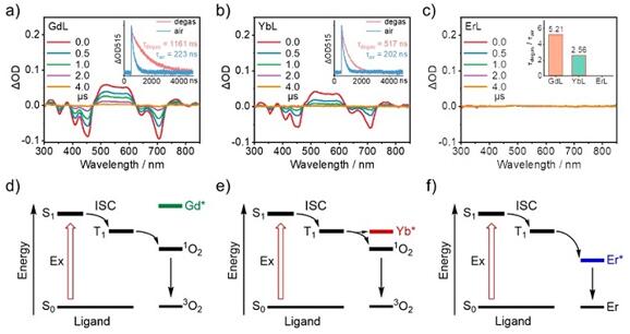 基于近红外吸收的咔唑卟啉配体,合成了一系列具有不同稀土金属中心(Ln = Gd,Yb,Er)的配合物。这些配合物在650-850 nm的光疗窗口有着较强的吸收,通过吸收、发射以及瞬态吸收光谱,并结合理论计算,揭示了Ln配合物在光激发下的能量耗散途径高度依赖于配体三重态和Ln离子激发态之间的能隙(图2)。其中,Yb配合物在产生单线态氧、放热及发光等能量耗散途径之间表现出了良好的平衡,同时实现光声成像、光热治疗、光动力治疗等功能。