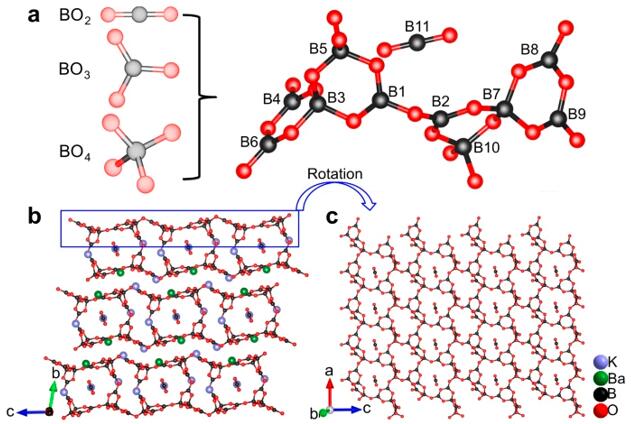 他们成功获得了一例硼酸盐新化合物K5Ba2(B10O17)2(BO2),该化合物结构中具有罕见的直线型BO2基团,亦是目前首例含有全部B-O键合构型的硼酸盐化合物。该团队通过固体核磁共振实验结合理论计算鉴定了其结构中存在的BO2基团,为今后该类基团的鉴别提供了参考。通过第一性原理阐明,相较于传统BO3和BO4基团,BO2基团具有更高的光学各向异性,基于此设计的仅含有BO2基团K(BO2)具有极大的双折射率(0.18@1064 nm),将深紫外双折射晶体的双折射率值推向了新高度,为设计合成高性能双折射晶体提供了新基因。