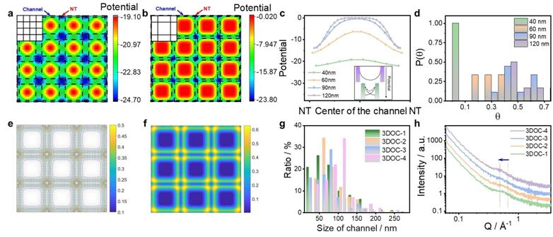研究人员选取铂纳米管(Pt NTs)为模型催化剂,利用气液界面组装和原位电化学刻蚀活化策略构筑了理想的最大程度暴露活性面的三维有序通道结构(3DOC),并选取甲醇氧化反应(MOR)作为模型反应对其电催化性能进行了测试。通过调节三维通道的尺寸大小,研究人员发现存在最佳的尺寸使得甲醇氧化性能最高,比传统滴涂形成的杂乱分布的催化剂性能提升近2倍。研究人员从电极表面的自由能密度函数出发,建立了一个全动力学模型,对不同孔径通道内甲醇分子的电势分布、传输速率、浓度分布以及三维通道的上下电子输运进行了模拟。结果表明,三维通道尺寸增大将极大地避免催化剂表面双电层的交叠,从而促进甲醇分子从体相电解质到催化剂表面双电层的传质过程(图2)。
