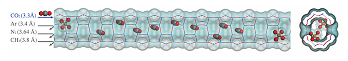 图1.杂原子丝光沸石一维孔道筛分CO2,Ar,N2和CH4的示意图