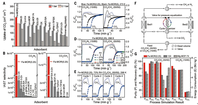 图2气体吸附分离性能:(A) 298 K时CO2体积吸收量;(B) CO2/N2:15/85和CO2/CH4:50/50 二元混合物在1 bar和298 K下的CO2/N2和CO2/CH4分离选择性;(C-E) CO2/N2(CH4)穿透曲线;(F) 2-床VSA工艺的流程示意图和(G) ASPEN模拟结果