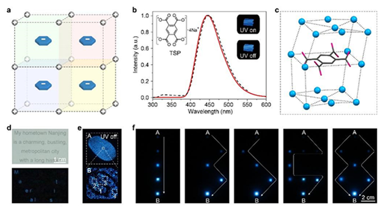 图1 (a)基于离子键构建的“发色团限域”模型;(b)TSP离子晶体的稳态光致发光和磷光光谱;(c)晶体中孤立发色团的限域环境;(d-f)防伪、指纹识别和余辉显示应用展示