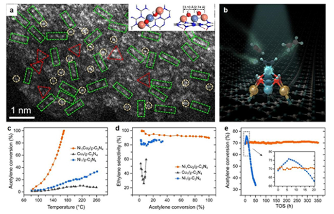 近日,中国科学技术大学路军岭、李微雪、韦世强等课题组合作,成功设计出一种高密度Ni1Cu2动态三原子新型非贵金属催化剂,并在富烯烃气氛中乙炔和1,3-丁二烯选择性加氢方面取得重要进展。研究成果以“金属载体相互作用和原子限域协同促进动态加氢”(Synergizing metal-support interactions and spatial confinement boosts dynamics of atomic nickel for hydrogenations)为题,于2021年7月26日在线发表于《自然·纳米技术》期刊上(Nature Nanotechnology, 2021, DOI: 10.1038/s41565-021-00951-y)。