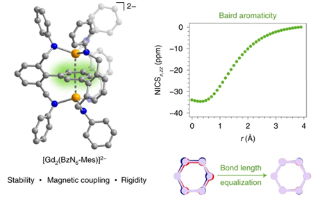 (1)作者合成了组成为[K(18-crown-6)(THF)2]2[M2(BzN6-Mes)](M=Y, Gd; BzN6-Mes=1,3,5-三[2′,6′-(N-均三甲苯)二甲基氨基-4′-叔丁基苯基]苯)的分子,该分子中三角形配体与两个三价Y/Gd金属在苯分子的两面分别配位,形成了反三明治分子结构。在该分子中,Gd3+通过反铁磁交换作用稳定三重态,使其成为分子基态。通过单晶X射线表征、化学位移计算验证了该分子具有芳香性,这个发现与Baird规则相符。