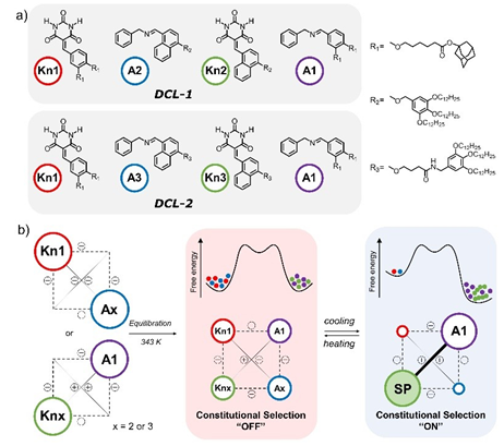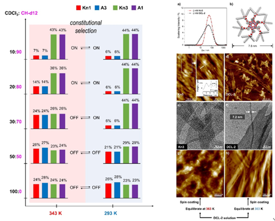 近日,中山大学化学学院Jean-Marie Lehn研究团队在前期对新型C=C/C=N动态共价交换反应的研究基础上(J. Am. Chem. Soc. 2018, 140, 5560; Chem. Asian J. 2021, 16, 44),以温变后的二阶超分子自组装作为驱动力,设计构建了具有三重动态的四组分动态组合库(图1)。以DCL-2为例,化合物Kn1和Kn3都能通过第一阶的双重氢键的自组装形成六元超分子环,而化合物Kn1结构的金刚烷基团因位阻效应阻止其进行第二阶的π-π堆积,与此同时Kn3能够顺利进行第二阶自组装形成丝状超分子聚合物。以Kn1和Kn3的能量差为驱动力,各组分通过C=C/C=N交换反应进行含量的重新排布,最终形成以化合物Kn3主导的偏离态分布,从而获得组分对环境温度的选择适应性。