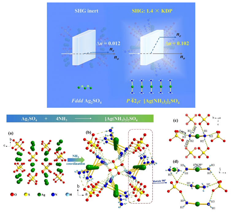 该工作近期以“[Ag(NH3)2]2SO4: A Strategy for the Coordination of Cationic Moieties to Design Nonlinear Optical Materials”为题发表在《德国应用化学》杂志上(DOI: 10.1002/anie.202107780)。