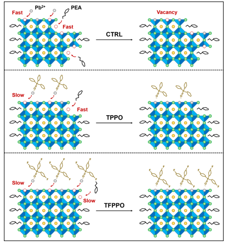 图1.三种钙钛矿发光薄膜的成膜过程示意图,其中PEA表示苯乙基铵盐,TPPO表示三苯基氧化膦,TFPPO表示三(4-氟苯基)氧化膦