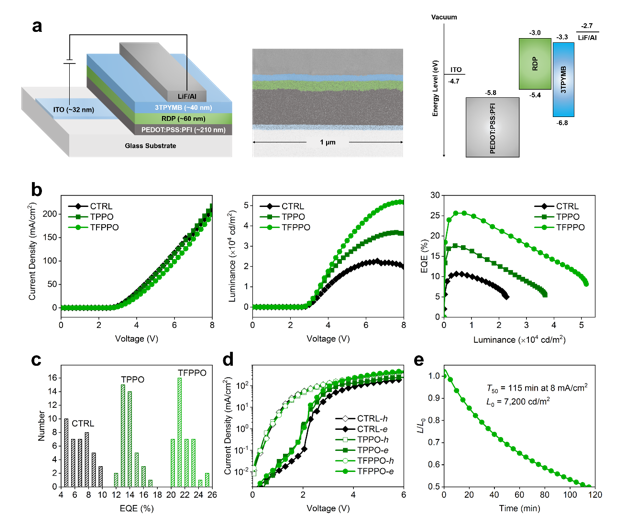 图2.(a)钙钛矿LED器件的结构示意图、截面透射电镜图和能级结构示意图;(b)三种钙钛矿LED器件对应的电流-电压曲线、亮度-电压曲线和外量子效率-亮度曲线;(c)三种钙钛矿LED器件的外量子效率统计分布图;(d)三种钙钛矿的单电子和单空穴器件的电流-电压曲线;(e)基于TFPPO处理的钙钛矿LED器件的工况寿命曲线。
