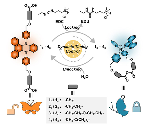 在该研究中,作者在DPAC的两端引入羧基封端的柔性链,将功能化的DPAC分子溶解在水性介质中,添加化学燃料EDC驱动分子内的环化反应,调控荧光团DPAC的构象自由度,改变荧光发射波长。这些分子锁通过和环境内水分子发生的水解反应,自动地解锁回到初始状态,实现了对体系时间尺度下的动力学控制。对侧链结构的精细化设计可以改变分子锁的荧光发射和寿命,实现对荧光颜色和动力学性质的多重调控。