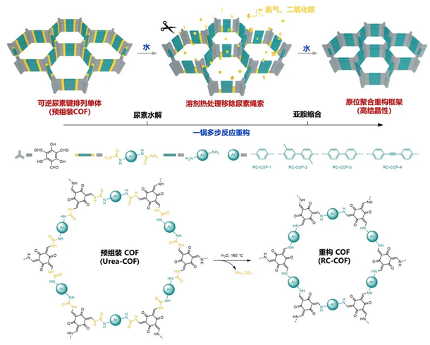 借鉴了超分子化学纳米限域反应和动态共价化学的理念,研究团队巧妙地将框架结晶和不可逆聚合步骤分离,提出了“重构共价有机框架”的合成策略:利用可逆共价键将有机基元“预组装”成晶态框架,再进行合成后的“限域重构”,实现了高稳定性结晶COF在常规合成条件下的高效制备和可规模化生产。