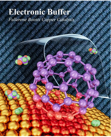 该技术的核心在于将富勒烯与铜催化剂相复合。富勒烯是一类纯碳团簇物质(与石墨和金刚石等同属于碳同素异形体),其中最为典型的代表是1985年发现的C60(笼状团簇结构见图示,发现者们获得了1996年度的诺贝尔化学奖)。在该工作中,研究团队合作发展了富勒烯-铜-二氧化硅催化剂(C60-Cu/SiO2),利用铜与富勒烯之间的可逆电子转移,发挥富勒烯的电子缓冲效应(electron buffering effect),稳定了催化剂中亚铜成分(图示中的表界面红色小区域),实现了草酸二甲酯常压催化加氢制乙二醇,并克服了副反应较多且催化剂易失活等问题。