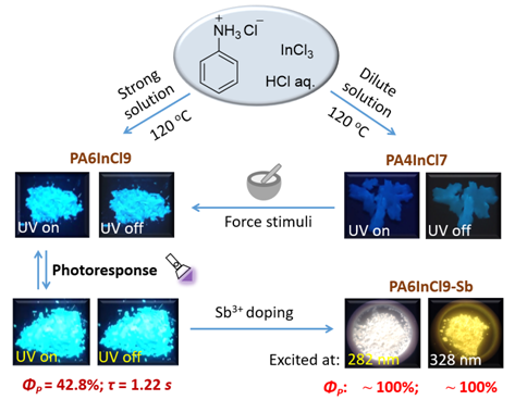 0维钙钛矿具有特殊的结构,即金属卤化物被有机阳离子隔离并包围形成球状团簇,有效避免了金属之间的相互作用和有机磷光团之间的三重态湮灭过程。因此该团队选择氯化铟和具有高三重态能级的苯胺盐酸盐,分别作为无机和有机前驱物合成了两个新型0D钙钛矿(PA6InCl9和PA4InCl7)。它们显示出了对外界光和力刺激敏感的蓝色RTP。光照下,PA6InCl9的RTP量子产率可从25.2%提高到42.8%。在机械力作用下,PA4InCl7表现出向PA6InCl9的相转变,从而使其RTP强度大幅提高,寿命高达1.2秒。