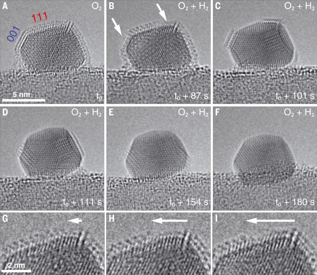 1.A-FO2700 mbar→ H260 mbar+ O2700 mbar)转变过程中,原SMSI包覆结构以及Pt颗粒的动态变化。(G-I) 放大的高分辨照片,SMSI包覆层从Pt颗粒表面逐渐移除。