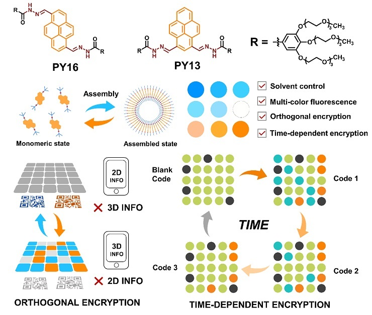 该工作成功合成了具备两个酰腙取代基元的两亲性分子,该分子的发光性能与分子的组装行为密切相关。研究者们通过亲疏水作用力调控分子的动态组装行为,实现对其荧光颜色的可逆调控,在很大范围内能够调节其发光颜色从蓝到橙并包含白光。基于这一动态荧光体系,研究者们进一步构建了三维码,荧光墨水等智能信息加密存储材料。进一步地,采用蒸发调控荧光策略,研究者们成功构建出时间尺度上的信息存储加密材料,即:荧光四维码(三维码+时间维度)。作者表示,在该材料上编码的信息具有时效性,在不同的时间读取会产生不同的结果,正确的信息只在特定的时间能被读取出来,进而有效地提高了信息的安全。