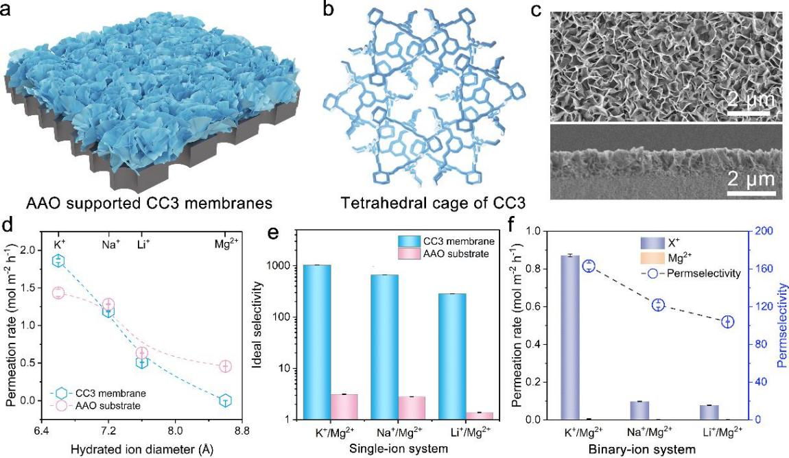 为进一步提升离子渗透选择性,团队通过界面生长策略构筑了自具离散框架结构的POC(CC3)离子分离膜,研究离子在多层次通道中的传递行为与分离特性。CC3是一种具有亚纳米级窗口和纳米级空腔的离散分子,通过窗口对窗口排列,形成由POC内腔和POC间外腔组成的连续通道。CC3亚纳米窗口可筛分一/二价离子,纳米空腔为一价离子提供快速传递途径,自具离散框架结构的离子通道可降低离子与框架壁面碰撞消耗的能量,促进离子渗透选择性的提升。因此,CC3膜表现出很高的一价阳离子渗透速率(1.0 mol m-2 h-1)和极低的二价阳离子透过率,实现了高的离子选择性,比如K+/Mg2+的选择性~1031,Na+/Mg2+的选择性~659,Li+/Mg2+的选择性~283(图1)。