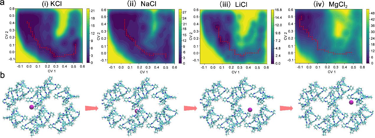 通过分子动力学模拟计算了离子在通道中迁移的自由能面,揭示了离子在离散CC3框架通道中的传输路径(图2a)。离子在CC3通道中由一个外腔传递到另一个外腔过程,以不同的水合状态通过CC3的窗口从外腔向内腔迁移,传递的能垒顺序为:K+ < Na+ <Li+ << Mg2+(图2b)。这项工作揭示了离子在POC离散框架通道中的传递特性,为开发高离子渗透选择性分离膜提供了理论指导。