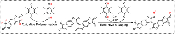 为了实现高性能的n型导电聚合物,研究人员经过对聚合反应以及掺杂进程精心设计,利用醌类氧化剂可逆的氧化还原特性,在以四甲基苯醌为氧化剂的条件下,首先利用氧化反应实现苯并双呋喃二酮前驱体的脱氢聚合;另外,随着聚合程度的提高,生成的聚合物具有极低的还原能级,同时生成的四甲基氢醌又具有一定的还原性,从而同步实现对聚合物的原位n型掺杂。该过程提高了聚合物的n型掺杂效率,获得了导电率达到2000 S cm-1的n型导电聚合物。