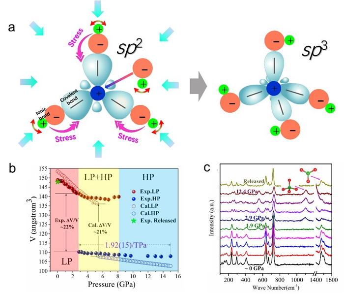 LiBO2中的sp2-sp3杂化转变。(a)“应力转移”工程;(b)超不可压缩性;(c)拉曼光谱中的[BO3]到[BO4]的转变。