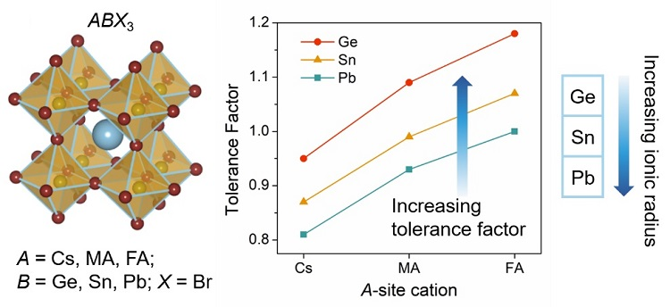 图1. 钙钛矿ABX3(A = Cs, MA和FA;B = Ge,Sn和Pb;X = Br)组合的一般结构与容忍因子的关系。
