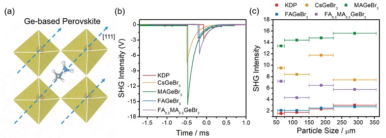 近日,南方科技大学化学系的毛陵玲教授课题组与新加坡国立大学Pieremanuele Canepa合作,基于已报道过的原型化合物CsGeBr3,构筑了一系列结晶于极性空间群的新型3D杂化锗基溴化钙钛矿(MAGeBr3、FAGeBr3、FA0.5MA0.5GeBr3;MA = CH3NH3、FA = CH(NH2)2)和FAGe0.56Sn0.44Br3,发展了一系列新型锗基杂化钙钛矿材料,具有可调控的带隙及二次谐波响应。其中MAGeBr3具有最大的SHG响应(5倍KH2PO4(KDP))。