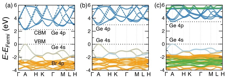 图3. DFT计算的材料能带结构(a为CsGeBr3, b为MAGeBr3, c为FAGeBr3),随着阳离子的增大CBM逐渐上移,带隙增大,与实验观察一致。