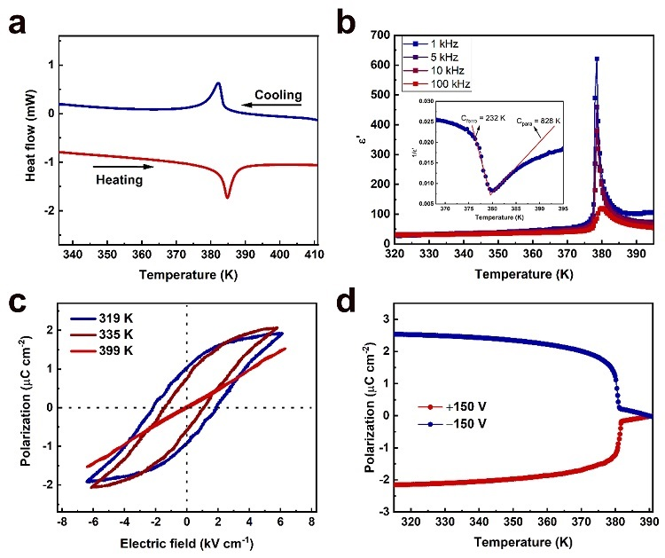 在该晶体中,Cu(II)离子和Cl离子组成的无机层被胱胺有机阳离子(NH3-CH2-CH2-S-S-CH2-CH2-NH3)2+隔开。基于-C-S-S-C-结构的螺旋特性,室温下胱胺阳离子表现出P-M -螺旋手性,并且单颗晶体中所有分子表现出相同手性,大量晶体表现出外消旋性。由于二硫键在晶体中具有相同的取向,室温下单晶结晶于极性点群。当温度升高时,胱胺阳离子变为无序,且两个无序组分呈中心对称,说明有机阳离子在晶格中可以于P-M螺旋构型之间相互转换。对应高温相单晶变为中心对称结构,铁电自发极化消失。这种极性到中心的晶格对称性变化通过单晶系统消光规律加以证实,进一步的DSC、介电温谱、铁电测试、热释电测试证明了单晶的铁电性质。