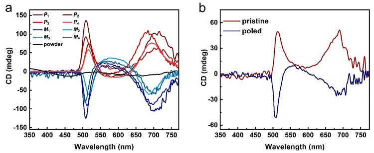 由于-C-S-S-C-结构片段螺旋取向不仅与分子手性有关,同时决定了分子的偶极矩方向,因此铁电极化方向与分子手性直接相关。通过对高温电场极化后的晶体进行单晶X-射线衍射分析和CD光谱表征,发现单晶的分子手性和铁电自发极化可以被外电场同步反转。