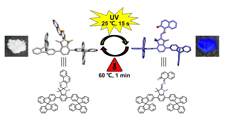 螺噁嗪类光致变色材料在信息存储、分子开关、分子成像等领域具有广泛应用价值,这些应用通常需要材料在固态时具有光致变色性能。但螺噁嗪类化合物在溶液中呈现良好的性能,固态时一般在高强度激光照射、长时间连续光照或低温条件才具有光致变色性能,制约了其实际应用,成为该领域面临的挑战性科学问题之一。为此,南开大学韩杰与赵斌教授团队及吉林大学杨英威教授合作,基于减色效应原理,将大位阻芳香基团引入螺噁嗪吲哚环4-及7-位,设计合成了新型螺噁嗪类光致变色化合物,实现了温和条件下固态光致变色,该类材料具有无底色、光响应迅速、耐疲劳性能优异等特点(图1)。