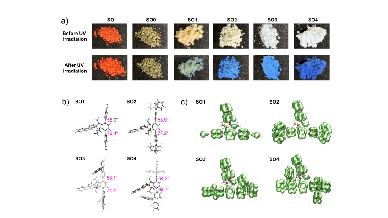 比较螺噁嗪化合物SO、SO0及SO1-SO4的固态粉末在室温时紫外光照前后的颜色变化,发现螺噁嗪吲哚环上4-和7-位引入大体积芳基基团产生明显的减色效应,导致化合物在紫外光照前没有底色,并具有固态变色性能(图2a)。理论计算表明SO1-SO4分子中两个芳基与螺噁嗪骨架之间具有较大的二面角(图2b),从而能够有效阻碍芳基基团与螺噁嗪骨架间的共轭作用并阻断π电子云重叠,合理解释了化合物的无底色现象。进一步通过理论计算结果显示SO1-SO4分子中π电子的电子定域化函数的二分点数值(ELF-π)分别为0.11、0.15、0.12、0.16,均远小于0.7(图2c)。说明引入的芳香基团不能与螺噁嗪骨架有效共轭,导致分子的整体π芳香性减弱并产生减色效应。